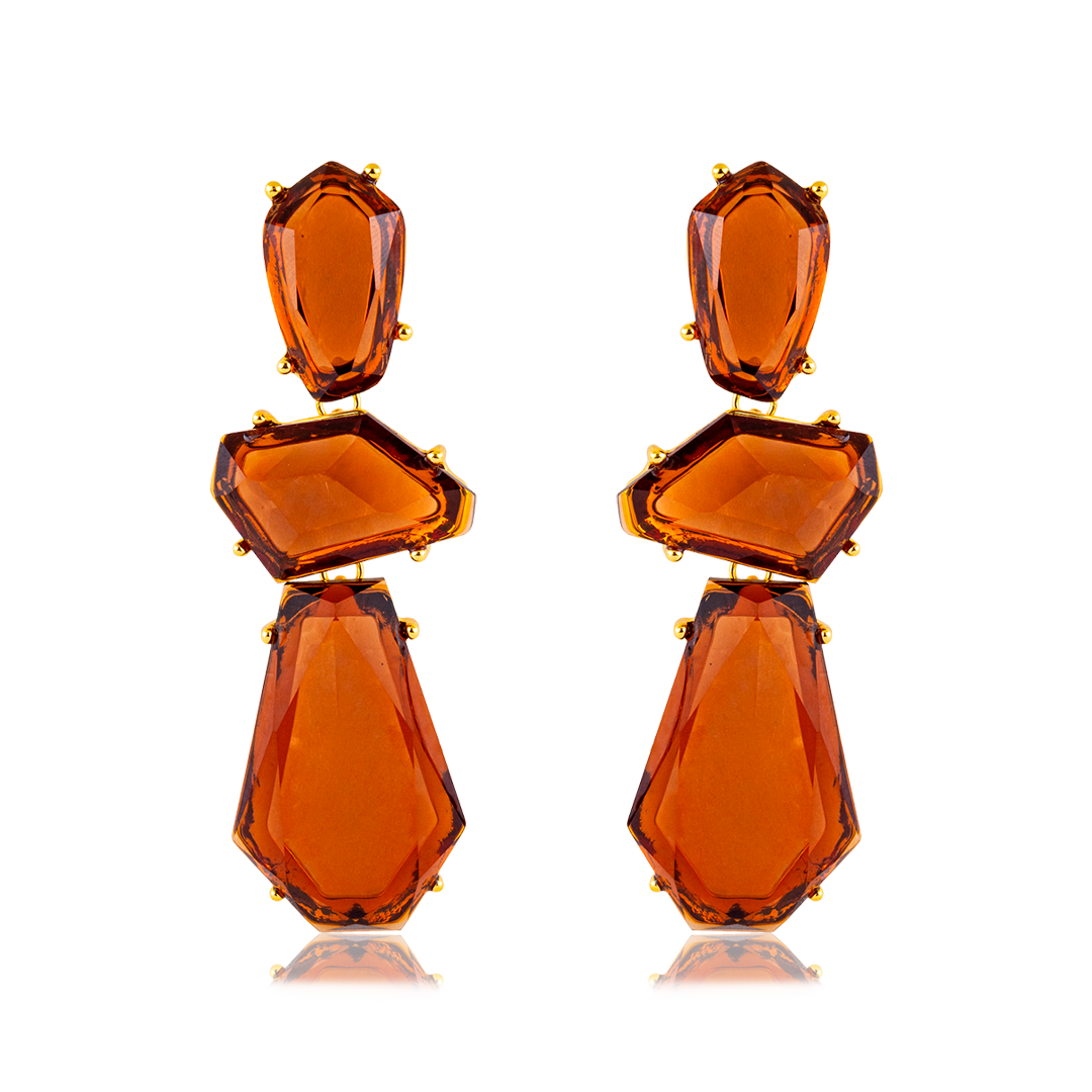 Brinco sofisticado com design marcante, BANHO DE OURO composto por pedras em tom âmbar intenso, lapidadas em formatos geométricos que criam um visual moderno e elegante. A combinação do brilho das pedras com o acabamento dourado proporciona um efeito luxuoso, ideal para destacar qualquer produção.